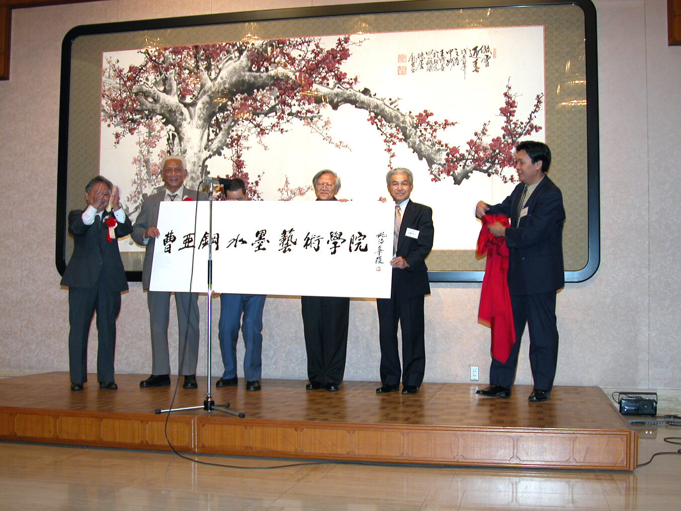 本学院は、1993年から、ほぼ毎年中国へ文化芸術交流訪問を行っています。2002年の日中国交正常化30周年には、福岡県日中友好協会関係の方々とともに約60名が訪中し、北京市首都博物館において「中日’平和と友好’書画芸術大展」を主催しました。翌2003年には中国から著名水墨芸術家30名を招いて福岡市美術館で「日中’平和と友好’書画芸術大展 日本福岡展」を開催して、中華人民共和国駐福岡総領事館において300人参加の日中友好パーテイを開きました。その後も毎年、中国、韓国から芸大教授、著名画家を客員教授として招き、水墨画のレベル向上と芸術視野を広める努力をしています。