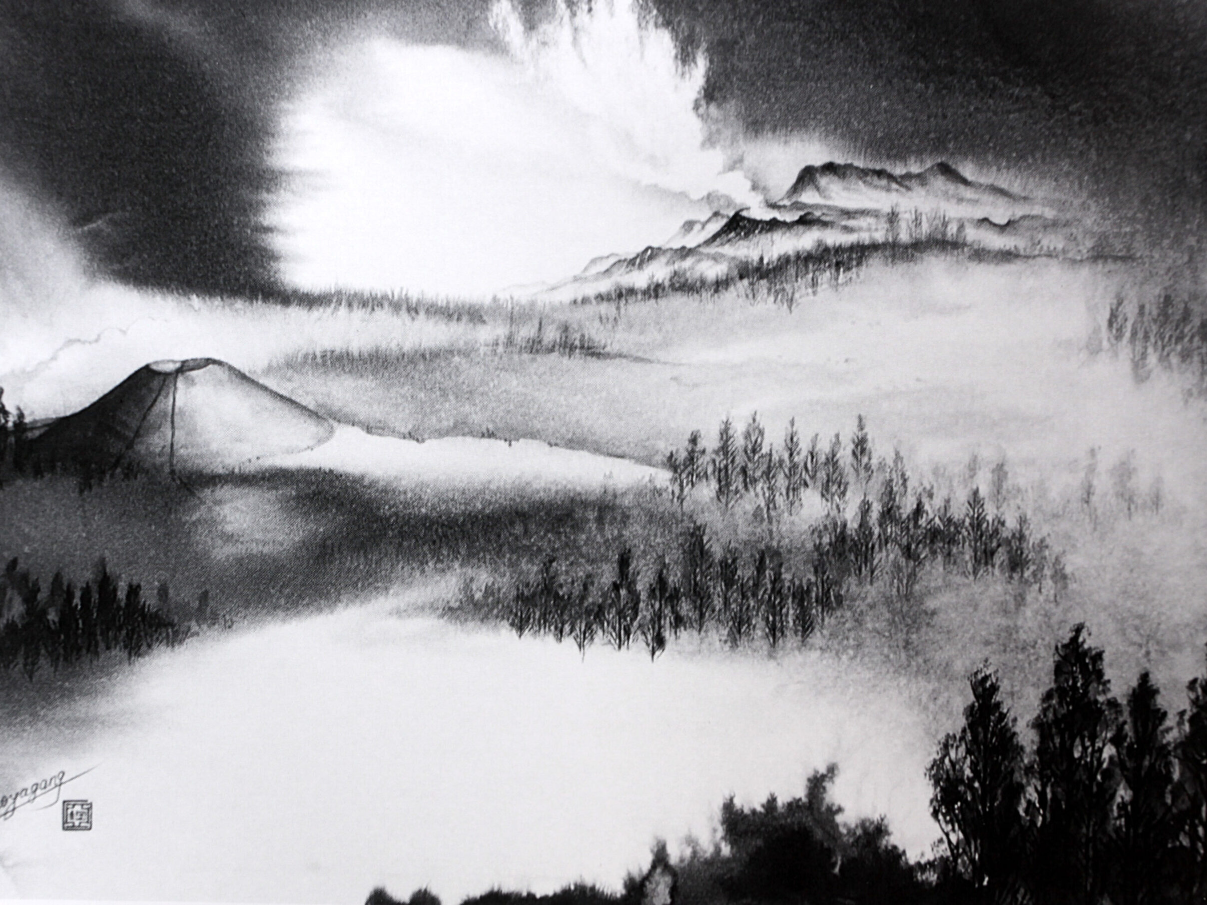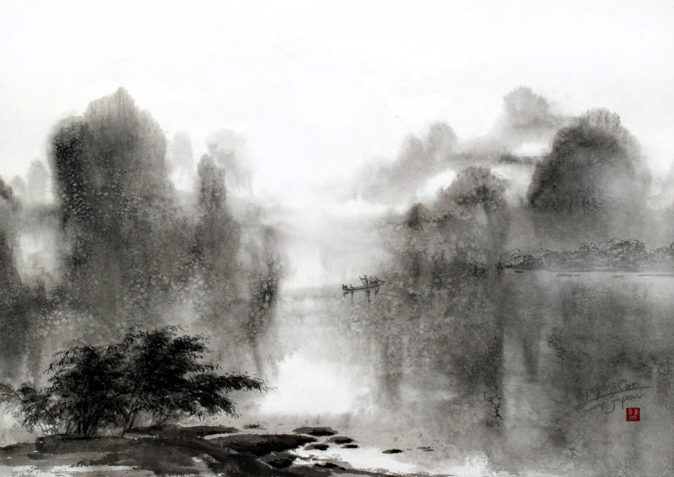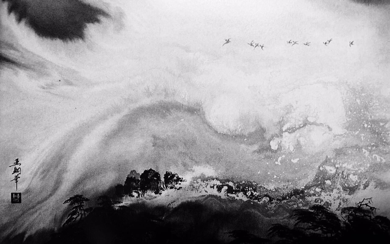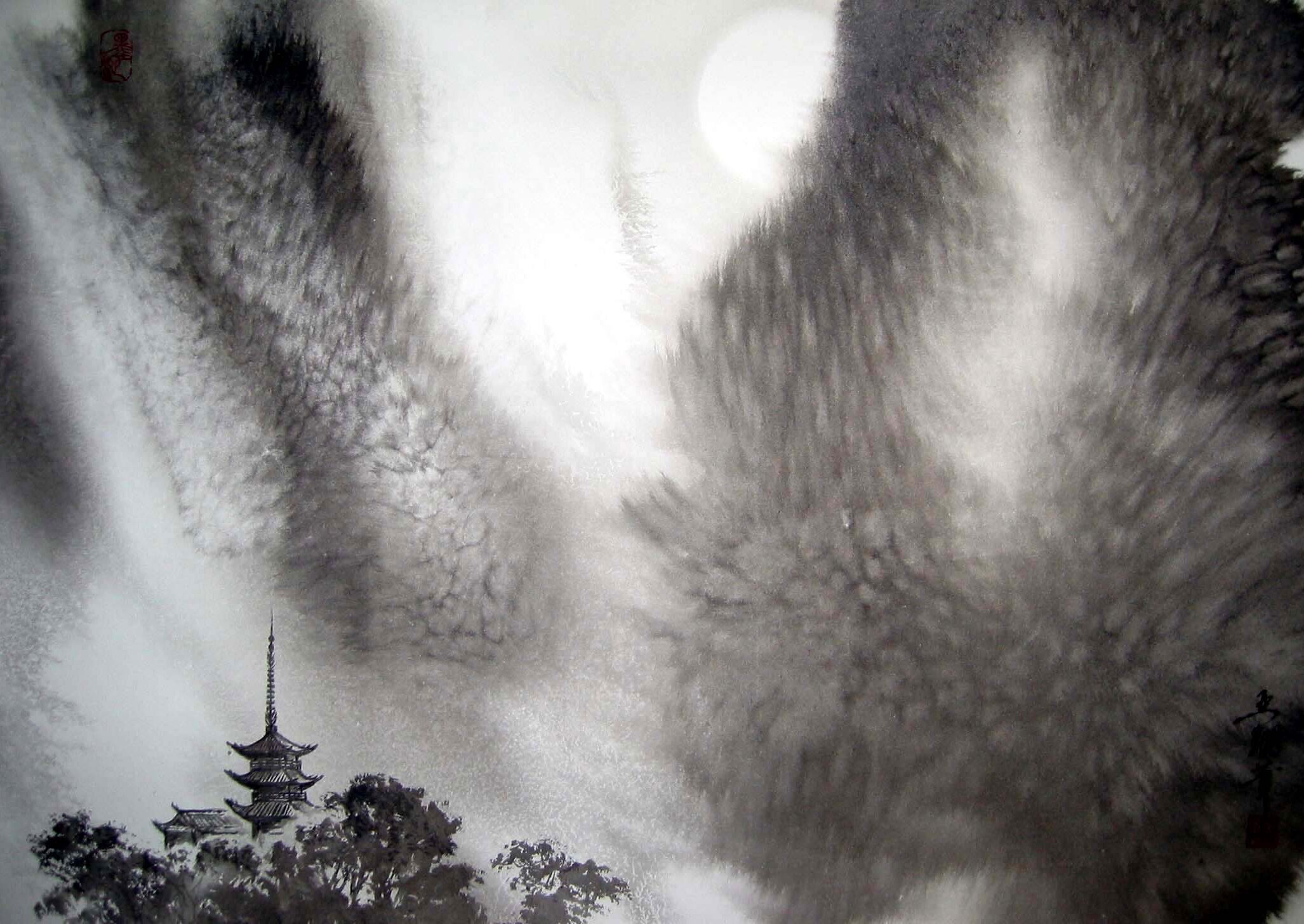 墨色の濃淡の変化によって立体感や正動感を表すところにその妙があります。唐の時代に初めて山水画に現れ、近代においては張大千が代表的な作者です。