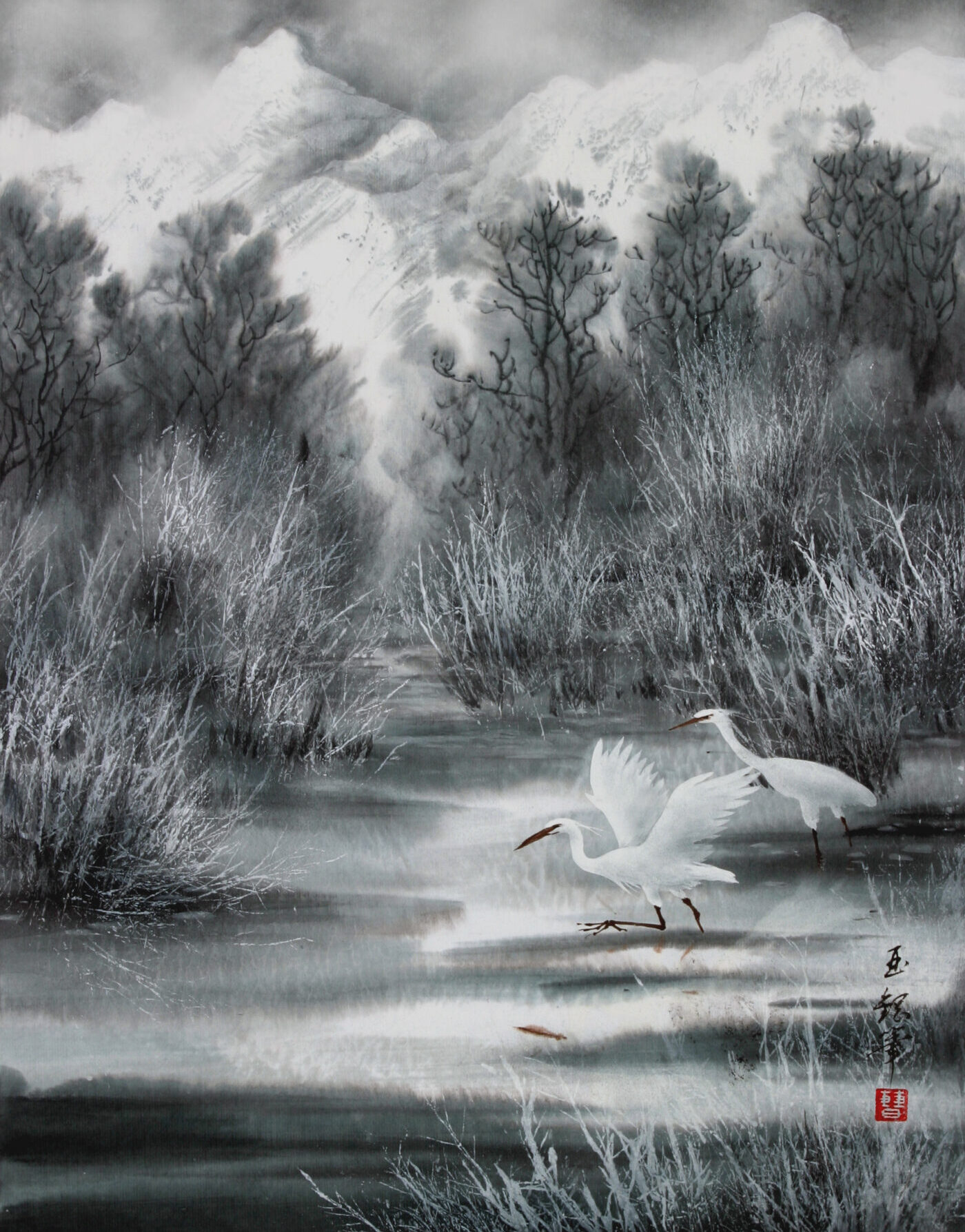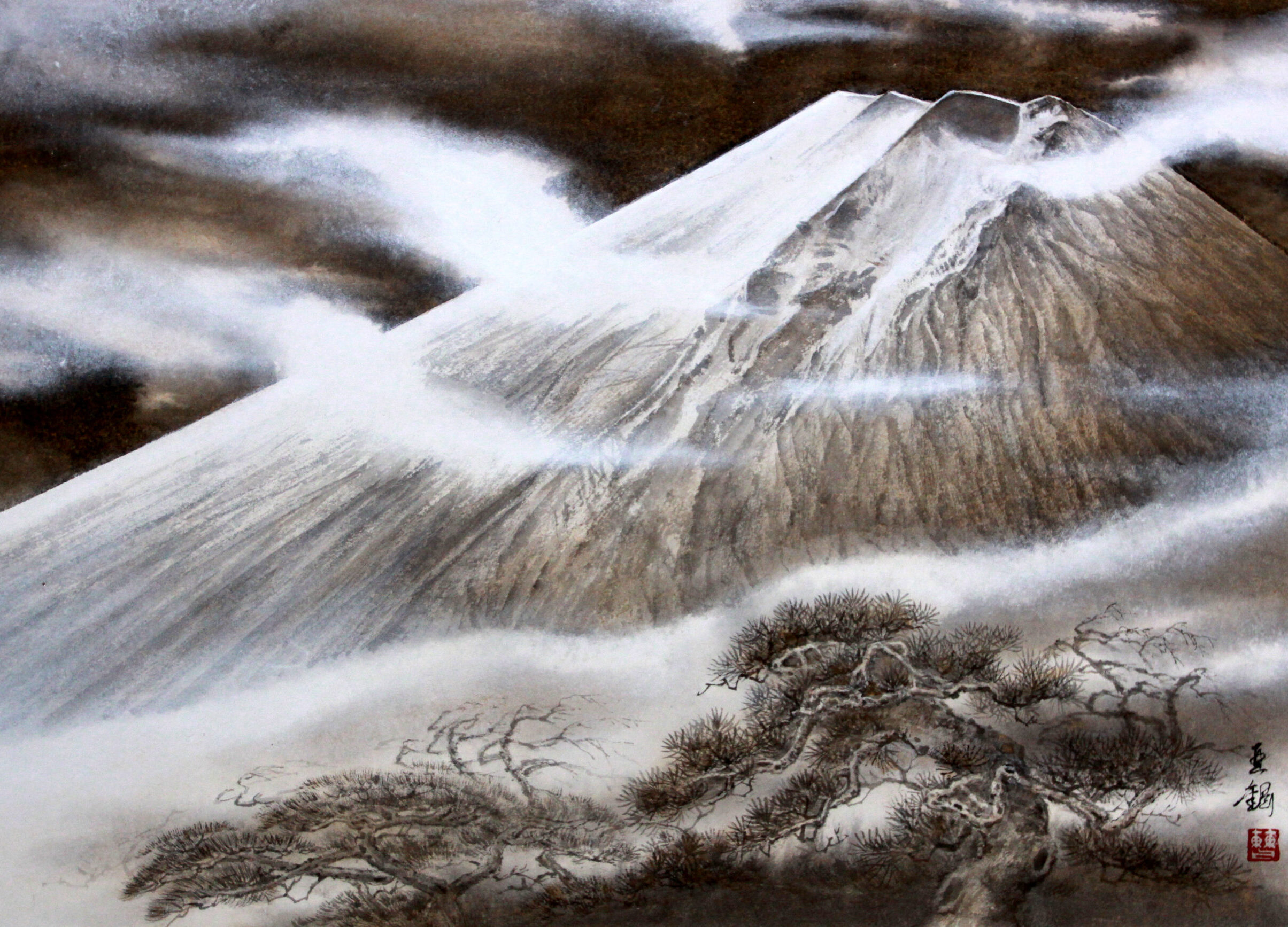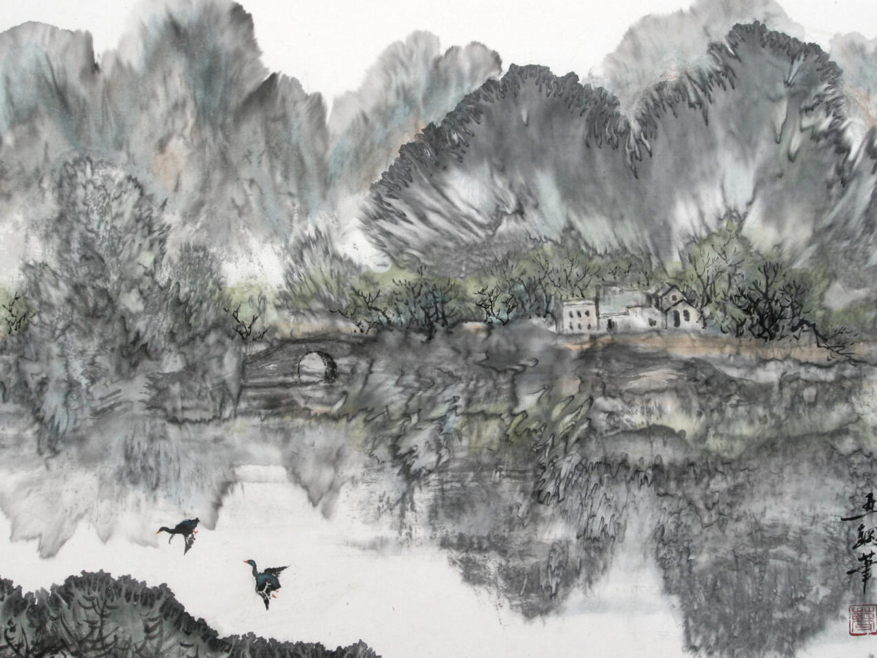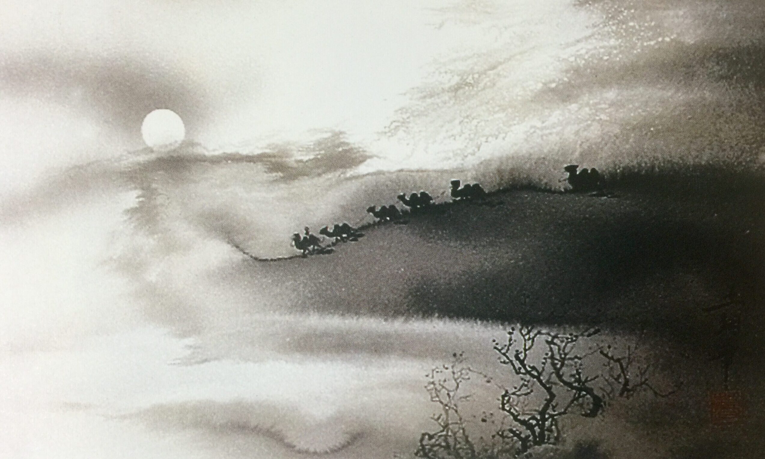 墨色の濃淡の変化によって立体感や正動感を表すところにその妙があります。唐の時代に初めて山水画に現れ、近代においては張大千が代表的な作者です。