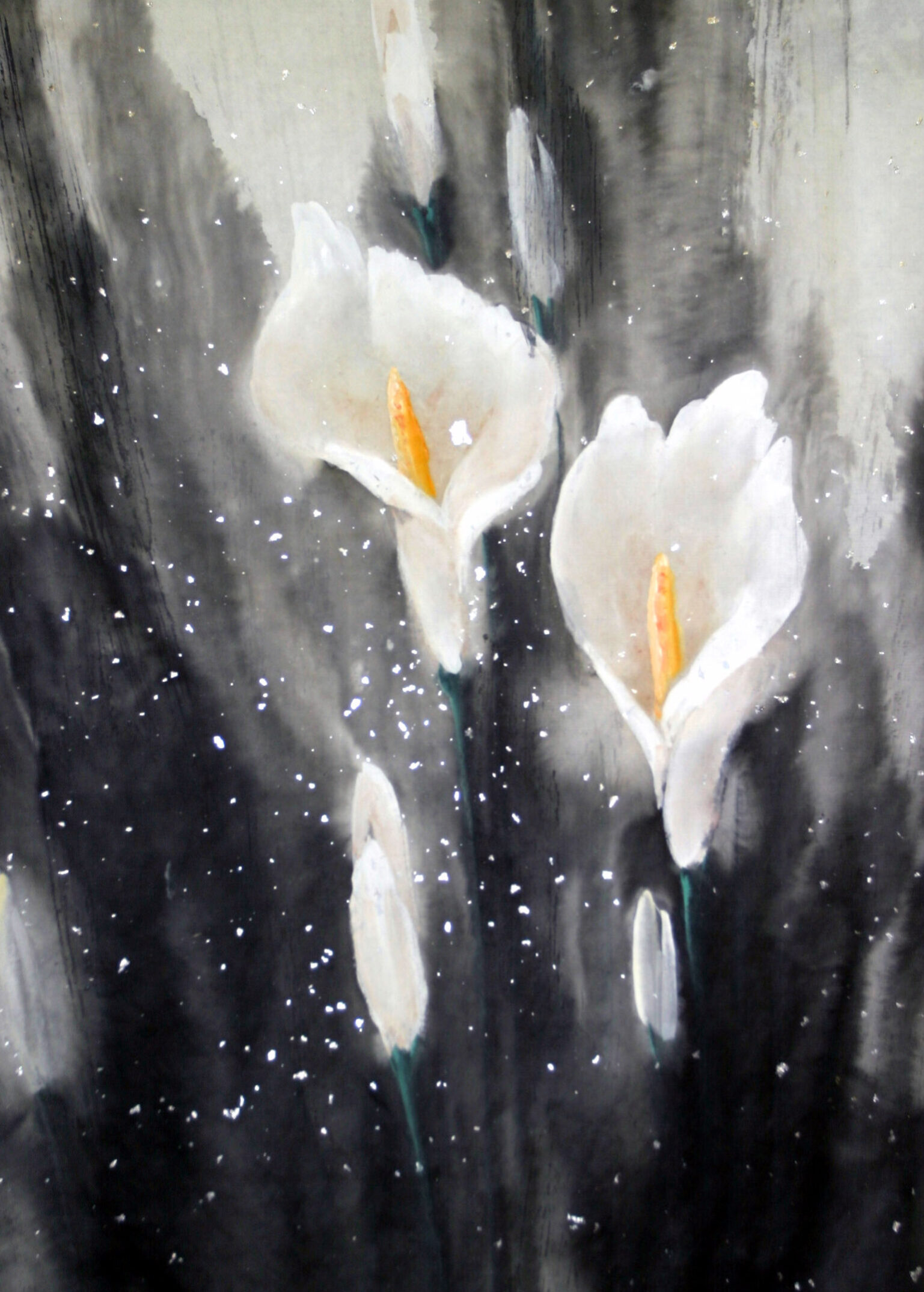 何を表現するか構想を元に墨を流していきますが、時に偶然の効果で、抽象的でもあり、独創的な作品になっています。