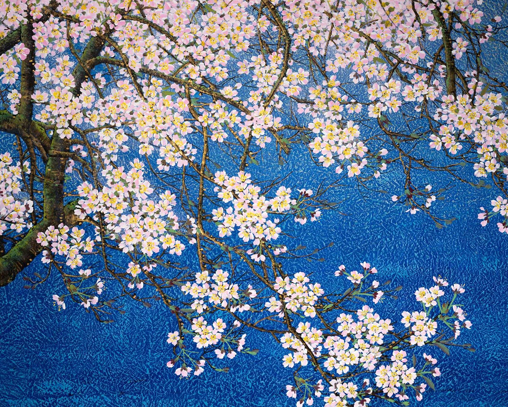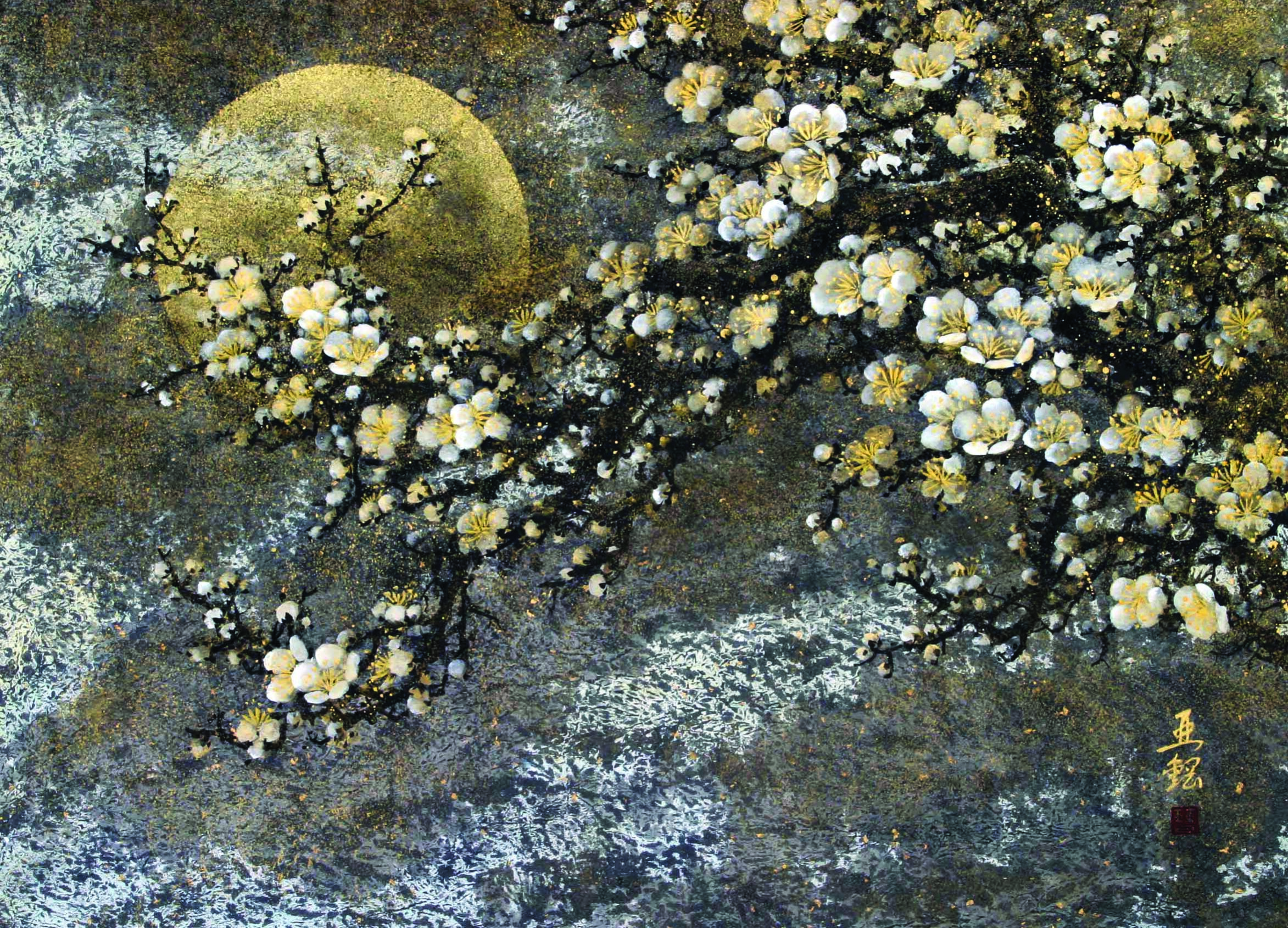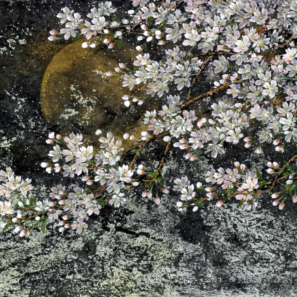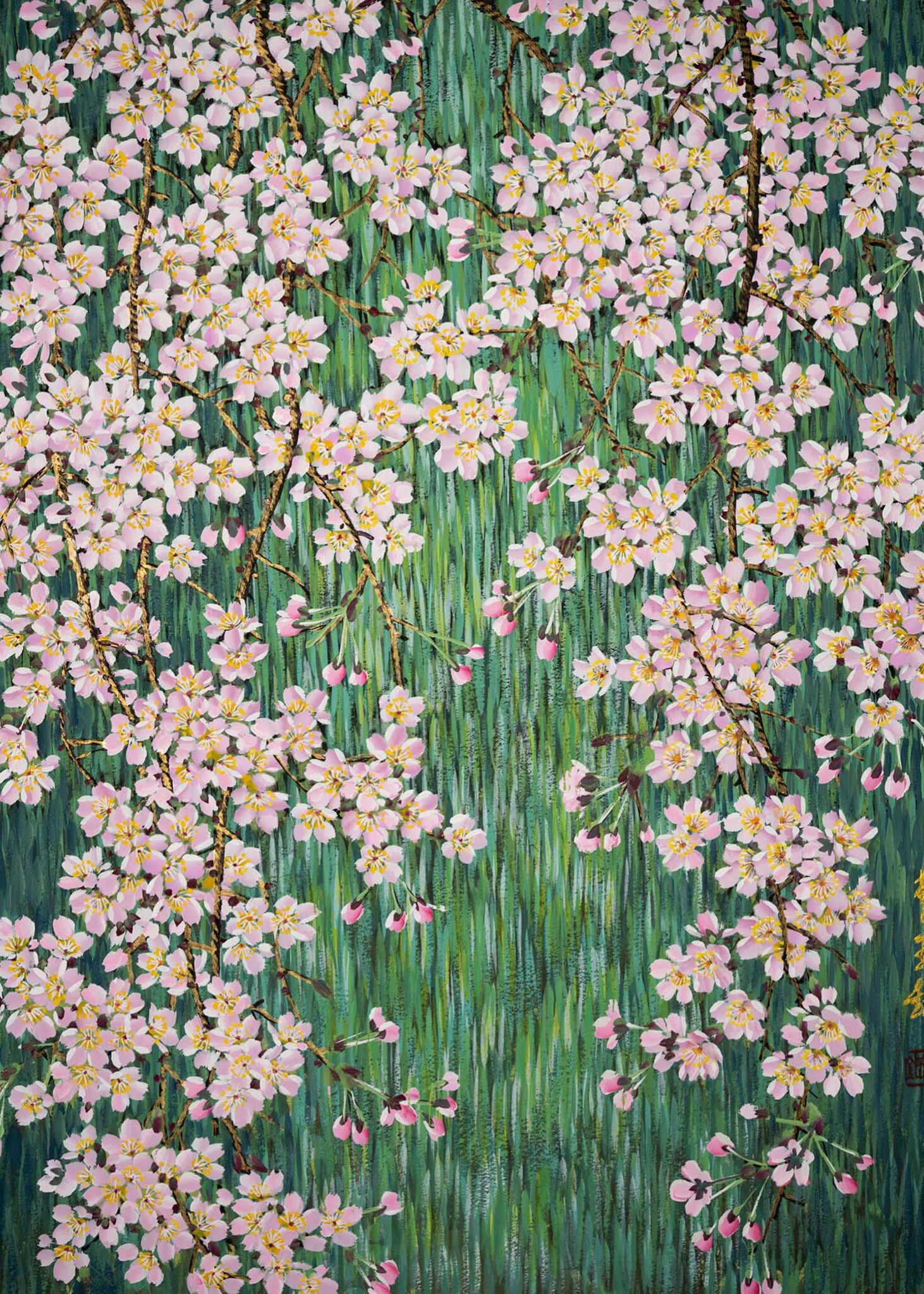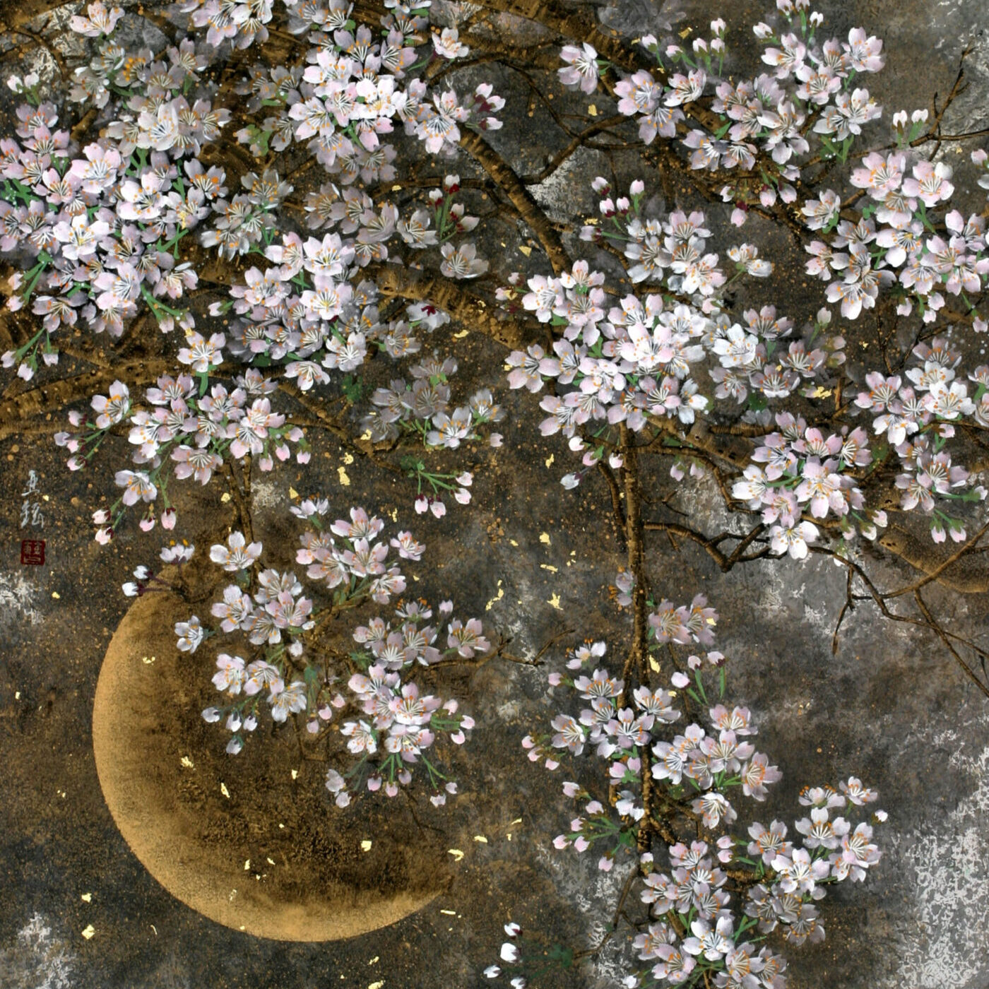 美術ジャーナリスト 永田 晶子 Art journalist Akiko Nagata おびただしい桜の花が、今を盛りと咲き誇って夜空に広がる。個々の花や枝々は写実手法で精緻に描かれているが、背景は濃い暗色に沈み、時代と場所を超越した抽象性を感じさせる。巨大な金色の満月にも墨が刷かれ、淡い桜色や花びらの形を引き立てる。画の前に立つ鑑賞者は、明日には散りゆく桜の可憐さと濃密な生命力が強く印象づけられるだろう。 曹亜鋼氏の「桜」シリーズは、1988年に来日して中国の伝統的な水墨画と日本画を融合すべく研鑽を重ねてきた氏が「初めて手ごたえを感じた」と振り返る絵画群だ。2011年に東京・上野の森美術館で開催された大規模個展を飾った100号の大作《月夜》《春意》をはじめ、様々な様態を陰影豊かに描き、代表作の一つになった。氏が私淑する日本画家の加山又造氏(1927~2004年)は、かつて「曹君の桜は立体感がある」と評したという。装飾性が高い華麗な作風で戦後日本画壇に新風をもたらした加山氏が注目した「立体感」について、まず私見を述べたい。 桜はいうまでもなく日本文化と密接に結びつくモチーフだ。春に一斉に開花する姿は日本の原風景ともいえ、一気に満開を迎えて散っていく姿は人間の儚い生や死の象徴とされた。しかし、桜を単体で描いた作品は、日本と中国の共通画題の「梅」と比べて多くない。江戸時代は桜の下で花見や行楽を楽しむ人々が名所絵や風俗画に頻繁に描かれ、山水図花鳥図にも散見されるが 、桜そのものを主役に据えた絵画が増えるのは明治以降と言える。近代日本画をけん引した横山大観は1930年のローマの日本美術展に出品した《夜桜図》が画業の転機とな り、奥村土牛や小林古径、東山魁夷ら世を去った巨匠から現代の中島千波氏や千住博氏まで数多くの画家が桜を主題にしてきた。 だが曹氏の桜の絵画は、近現代の日本画よりむしろ桃山期の天才絵師・長谷川久蔵による京都の智積院の障 壁画《桜図》を思い起こさせる。水墨画の傑作とされる国宝「松林図屏風」の作者・長谷川等伯の息子久蔵が八重桜を描いた本作は、一つ一つの花が胡粉を盛り上げて立体的に表現され、強い存在感を持つ。桜を主題にした唯一の国宝としても知られている。やや乱暴な言い方にな るが、ここでは儚いだけでない桜本来の力強さや生命力が、桜表現の様式化や象徴化が強まる前のみずみずしい眼で捉えられていると思う。 曹氏が描く桜は、《桜図》のように物理的に厚みがあるわけではないが、通底する立体的な迫真を感じさせる。「花がすみ」と呼ばれるように、近現代日本画において桜は淡い色のマッス(塊)にしばしば表現されるが、曹作品は一輪一輪が明快な姿を持つ。茫洋とかすむ全体美でなく、個々の花を凝視したリアルさがある。 制作手法を聞いて驚いたのは、氏が桜専用の絵筆を考案していたことだ。独自の切り込みを施した筆を用いることで蕾から落花寸前まであらゆる花びらの形状を精妙に再現できるという。そのうえで、一輪ずつ濃淡の陰影を加えていく。様々な意匠の桜の作品を手掛け名手とうたわれた加山氏が称揚した「立体感」は、そうした気が遠くなるような丹精から生まれたものだったのだ。 ここで曹氏の歩みを簡潔に振り返っておきたい。1960年に中国吉林省に生まれた氏は、画家で大学教授 の父とデザイン専門家の母に絵の手ほどを受け、次いで地元天津の大学で水墨画をはじめ様々な技法を学んだ。 転機は、天津紡績大学(現・天津工業大学)美術科講師を務めていた1987年。北京の中央美術学院で行われた加山氏の講演に大きな感銘を受け翌年、日本留学に踏み切った。国立福岡教育大学で日本画などを学び、同大学院修了後は北九州市のデザイン会社に就職したが、絵画への思いが募り、退職して画業に専念。主に福岡を拠点として、伝統的な中国水墨画をベースに日本の情景や美意識を自在に取り入れた独自の画風を編み出し、日中両国や欧米で個展を重ねてきた。伝統を刷新し水墨画の新境地を開いた画業は母国でも高く評価され、中国一級美術師・教授の称号を授与されている。 「初来日から35年、つねに『日本にいてこそ自分が描け る絵とは何か?』を考えている。中国水墨画は約2000年の歴史があり、世界に誇る名作群を生んだが、伝統的な絵画制作を繰り返しても未来はない。似ているようで実 は異なる特性を持つ日本画の技法や素材、美学を理解し取り入れることが自分の個性の確立につながり、中国と日本文化の新たな架け橋にもなる」と氏は語る。 桜以外の作品を見ても、そのパワフルな結合に目を奪われる。例えば、墨を底色に使い岩彩の色を浮かび上がらせた「重彩色」シリーズ。筆者が古代中国・馬王堆漢墓の出土品を連想した深みがある臙脂色や翡翠色を背景 に 、寺院や深山幽谷 、鳥が繊細な筆致で描かれる。モチーフの多くは日本の自然や建築から着想を得ているが、鮮烈な色遣いが場面の幻想性を高め、どこの国ともつか