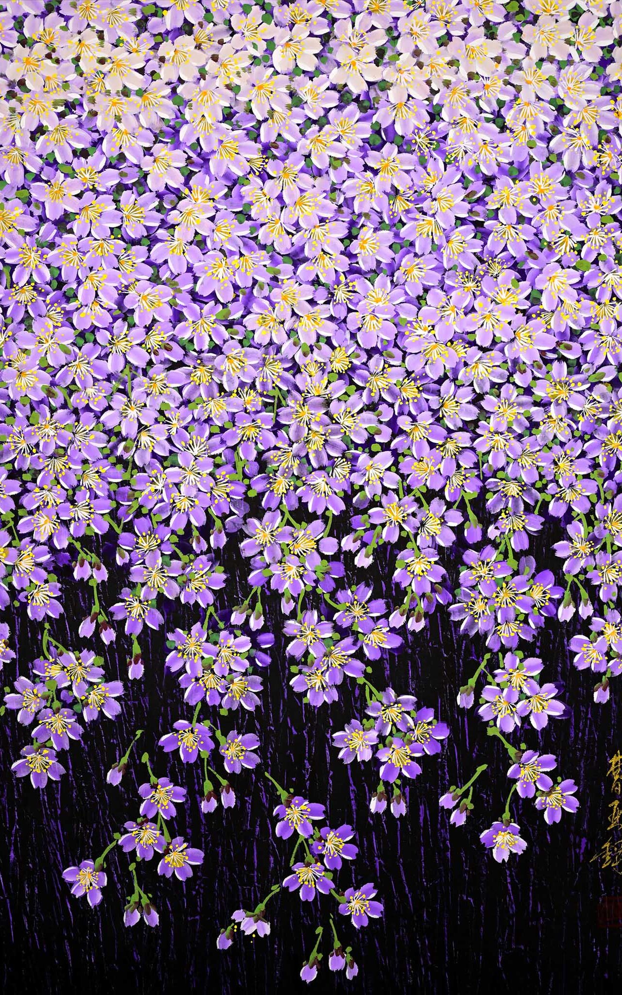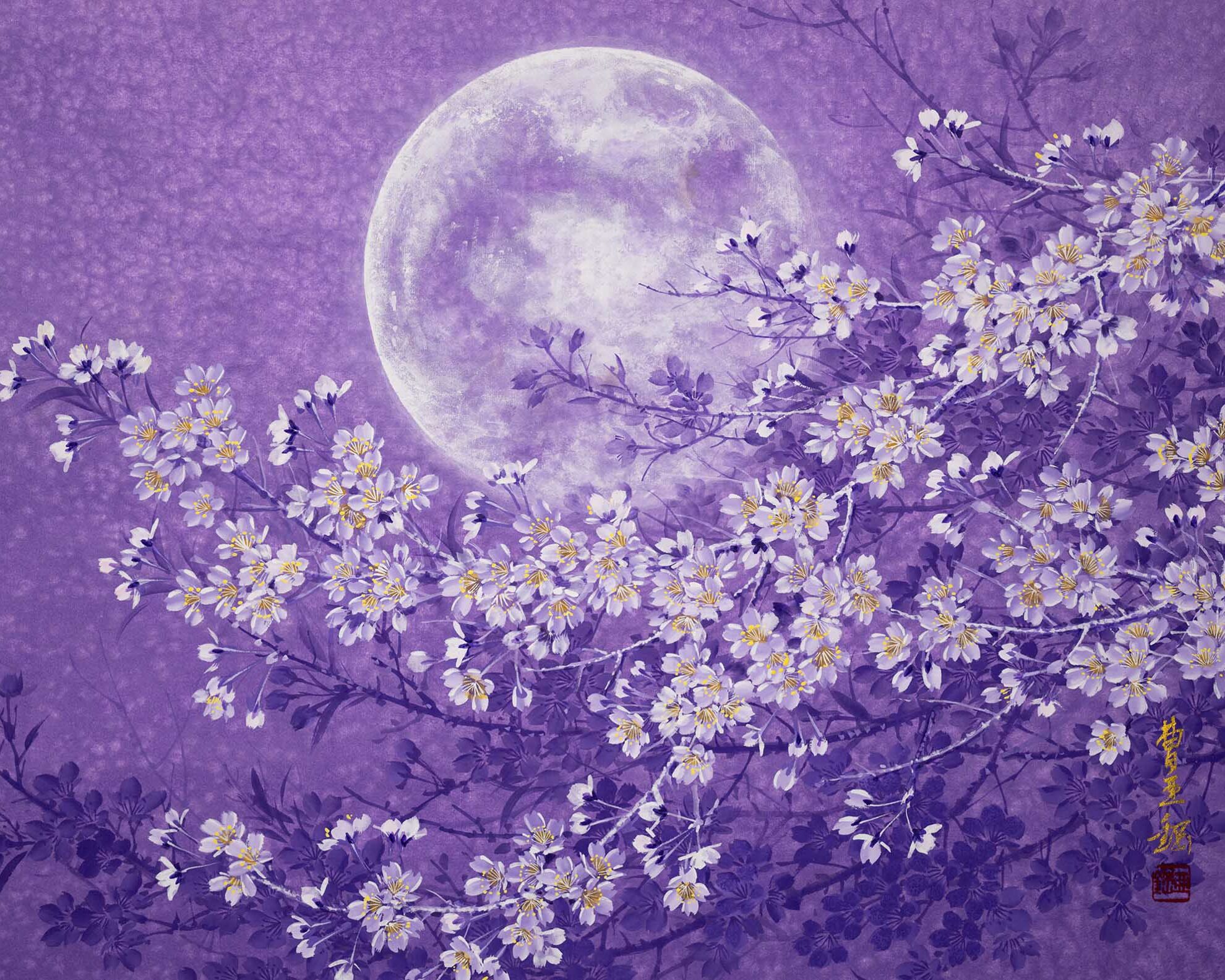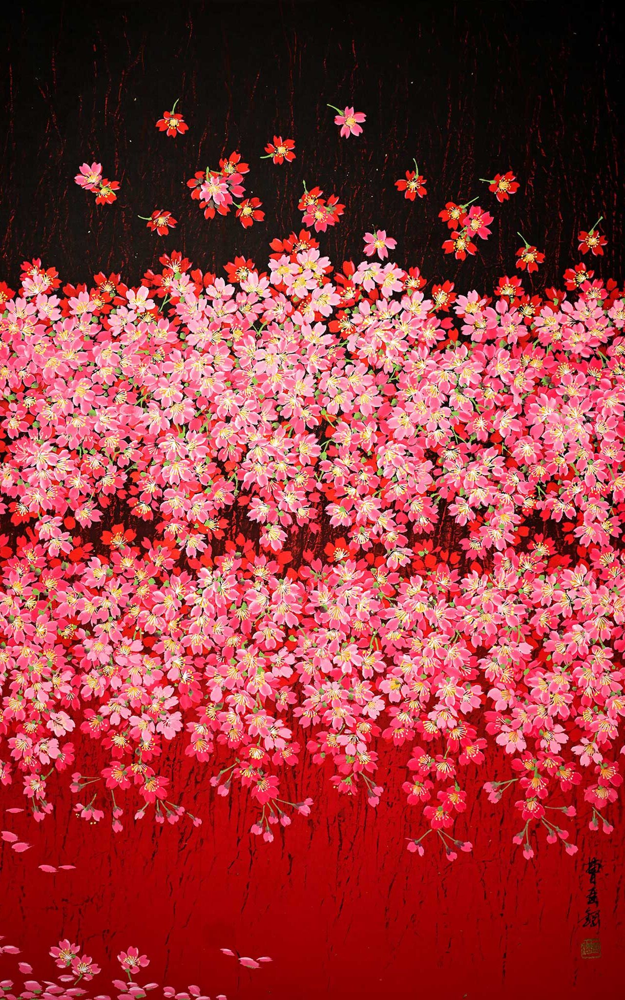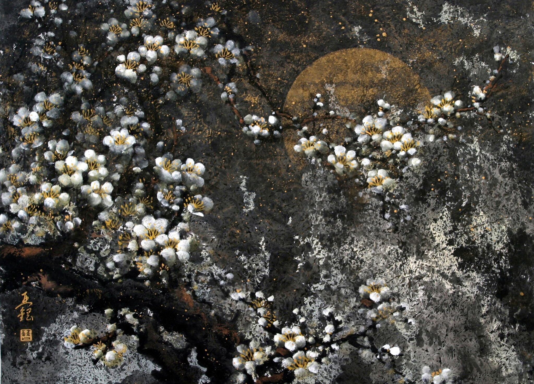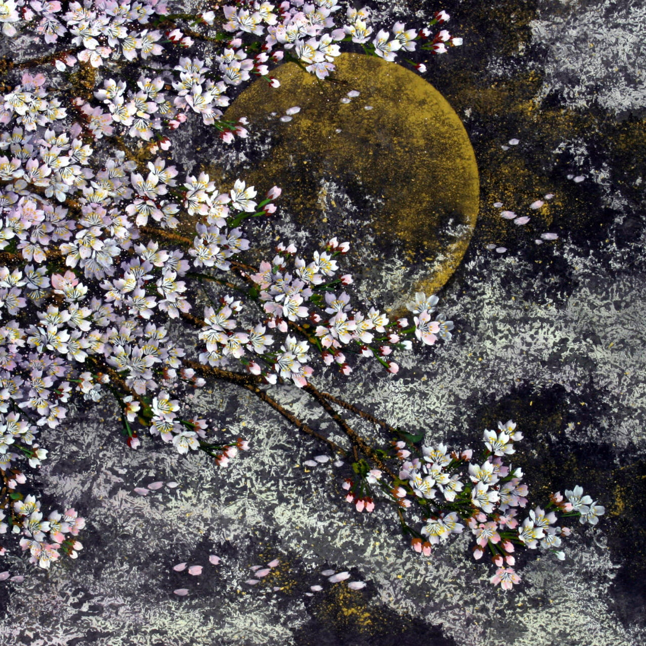 美術ジャーナリスト 永田 晶子 Art journalist Akiko Nagata おびただしい桜の花が、今を盛りと咲き誇って夜空に広がる。個々の花や枝々は写実手法で精緻に描かれているが、背景は濃い暗色に沈み、時代と場所を超越した抽象性を感じさせる。巨大な金色の満月にも墨が刷かれ、淡い桜色や花びらの形を引き立てる。画の前に立つ鑑賞者は、明日には散りゆく桜の可憐さと濃密な生命力が強く印象づけられるだろう。 曹亜鋼氏の「桜」シリーズは、1988年に来日して中国の伝統的な水墨画と日本画を融合すべく研鑽を重ねてきた氏が「初めて手ごたえを感じた」と振り返る絵画群だ。2011年に東京・上野の森美術館で開催された大規模個展を飾った100号の大作《月夜》《春意》をはじめ、様々な様態を陰影豊かに描き、代表作の一つになった。氏が私淑する日本画家の加山又造氏(1927~2004年)は、かつて「曹君の桜は立体感がある」と評したという。装飾性が高い華麗な作風で戦後日本画壇に新風をもたらした加山氏が注目した「立体感」について、まず私見を述べたい。 桜はいうまでもなく日本文化と密接に結びつくモチーフだ。春に一斉に開花する姿は日本の原風景ともいえ、一気に満開を迎えて散っていく姿は人間の儚い生や死の象徴とされた。しかし、桜を単体で描いた作品は、日本と中国の共通画題の「梅」と比べて多くない。江戸時代は桜の下で花見や行楽を楽しむ人々が名所絵や風俗画に頻繁に描かれ、山水図花鳥図にも散見されるが 、桜そのものを主役に据えた絵画が増えるのは明治以降と言える。近代日本画をけん引した横山大観は1930年のローマの日本美術展に出品した《夜桜図》が画業の転機とな り、奥村土牛や小林古径、東山魁夷ら世を去った巨匠から現代の中島千波氏や千住博氏まで数多くの画家が桜を主題にしてきた。 だが曹氏の桜の絵画は、近現代の日本画よりむしろ桃山期の天才絵師・長谷川久蔵による京都の智積院の障 壁画《桜図》を思い起こさせる。水墨画の傑作とされる国宝「松林図屏風」の作者・長谷川等伯の息子久蔵が八重桜を描いた本作は、一つ一つの花が胡粉を盛り上げて立体的に表現され、強い存在感を持つ。桜を主題にした唯一の国宝としても知られている。やや乱暴な言い方にな るが、ここでは儚いだけでない桜本来の力強さや生命力が、桜表現の様式化や象徴化が強まる前のみずみずしい眼で捉えられていると思う。 曹氏が描く桜は、《桜図》のように物理的に厚みがあるわけではないが、通底する立体的な迫真を感じさせる。「花がすみ」と呼ばれるように、近現代日本画において桜は淡い色のマッス(塊)にしばしば表現されるが、曹作品は一輪一輪が明快な姿を持つ。茫洋とかすむ全体美でなく、個々の花を凝視したリアルさがある。 制作手法を聞いて驚いたのは、氏が桜専用の絵筆を考案していたことだ。独自の切り込みを施した筆を用いることで蕾から落花寸前まであらゆる花びらの形状を精妙に再現できるという。そのうえで、一輪ずつ濃淡の陰影を加えていく。様々な意匠の桜の作品を手掛け名手とうたわれた加山氏が称揚した「立体感」は、そうした気が遠くなるような丹精から生まれたものだったのだ。 ここで曹氏の歩みを簡潔に振り返っておきたい。1960年に中国吉林省に生まれた氏は、画家で大学教授 の父とデザイン専門家の母に絵の手ほどを受け、次いで地元天津の大学で水墨画をはじめ様々な技法を学んだ。 転機は、天津紡績大学(現・天津工業大学)美術科講師を務めていた1987年。北京の中央美術学院で行われた加山氏の講演に大きな感銘を受け翌年、日本留学に踏み切った。国立福岡教育大学で日本画などを学び、同大学院修了後は北九州市のデザイン会社に就職したが、絵画への思いが募り、退職して画業に専念。主に福岡を拠点として、伝統的な中国水墨画をベースに日本の情景や美意識を自在に取り入れた独自の画風を編み出し、日中両国や欧米で個展を重ねてきた。伝統を刷新し水墨画の新境地を開いた画業は母国でも高く評価され、中国一級美術師・教授の称号を授与されている。 「初来日から35年、つねに『日本にいてこそ自分が描け る絵とは何か?』を考えている。中国水墨画は約2000年の歴史があり、世界に誇る名作群を生んだが、伝統的な絵画制作を繰り返しても未来はない。似ているようで実 は異なる特性を持つ日本画の技法や素材、美学を理解し取り入れることが自分の個性の確立につながり、中国と日本文化の新たな架け橋にもなる」と氏は語る。 桜以外の作品を見ても、そのパワフルな結合に目を奪われる。例えば、墨を底色に使い岩彩の色を浮かび上がらせた「重彩色」シリーズ。筆者が古代中国・馬王堆漢墓の出土品を連想した深みがある臙脂色や翡翠色を背景 に 、寺院や深山幽谷 、鳥が繊細な筆致で描かれる。モチーフの多くは日本の自然や建築から着想を得ているが、鮮烈な色遣いが場面の幻想性を高め、どこの国ともつか