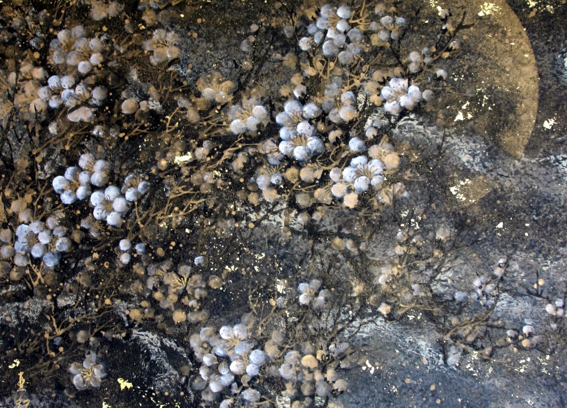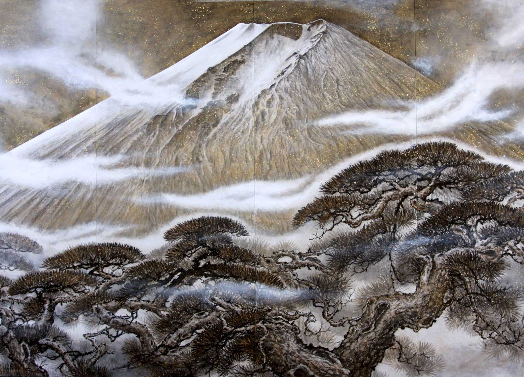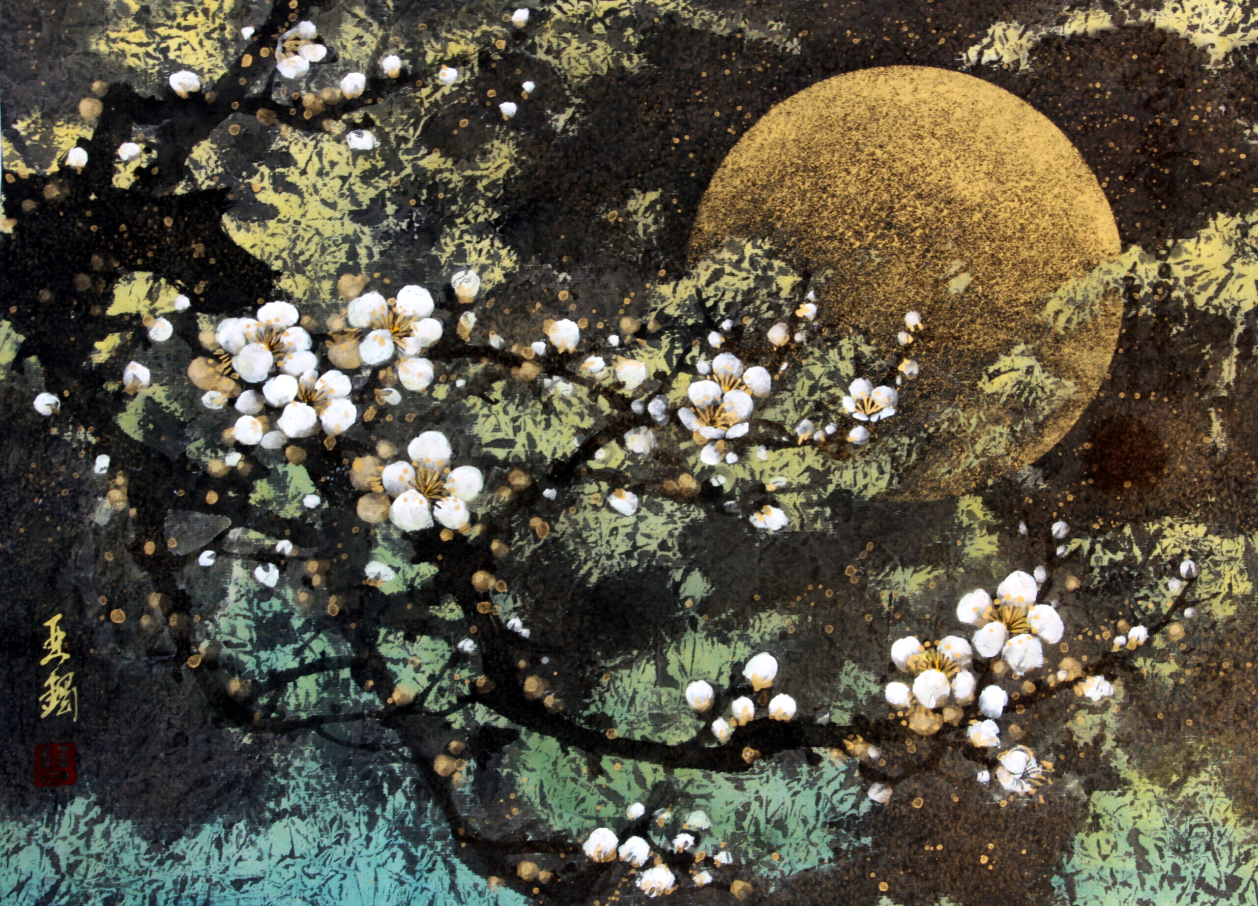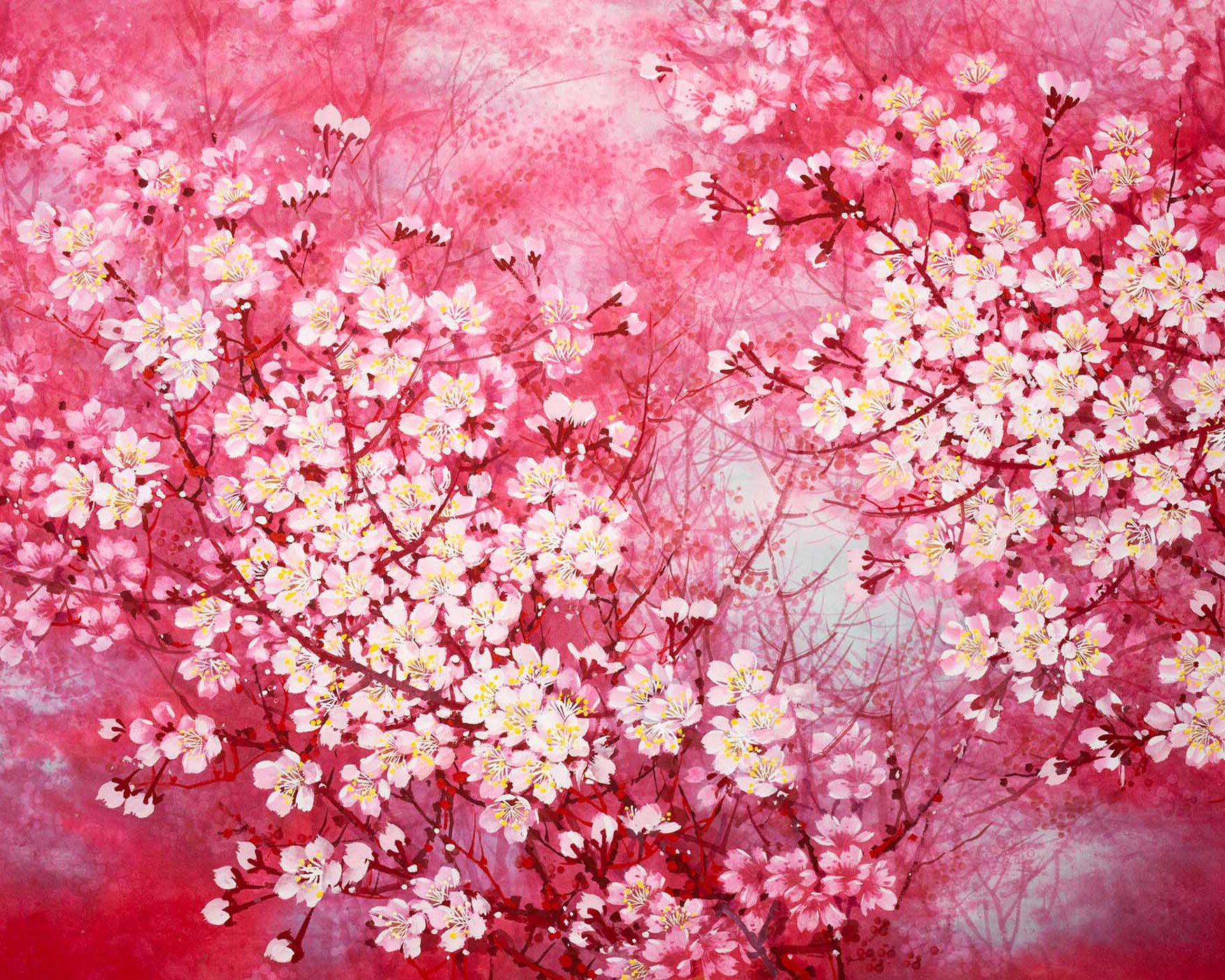 美術ジャーナリスト 永田 晶子 Art journalist Akiko Nagata おびただしい桜の花が、今を盛りと咲き誇って夜空に広がる。個々の花や枝々は写実手法で精緻に描かれているが、背景は濃い暗色に沈み、時代と場所を超越した抽象性を感じさせる。巨大な金色の満月にも墨が刷かれ、淡い桜色や花びらの形を引き立てる。画の前に立つ鑑賞者は、明日には散りゆく桜の可憐さと濃密な生命力が強く印象づけられるだろう。 曹亜鋼氏の「桜」シリーズは、1988年に来日して中国の伝統的な水墨画と日本画を融合すべく研鑽を重ねてきた氏が「初めて手ごたえを感じた」と振り返る絵画群だ。2011年に東京・上野の森美術館で開催された大規模個展を飾った100号の大作《月夜》《春意》をはじめ、様々な様態を陰影豊かに描き、代表作の一つになった。氏が私淑する日本画家の加山又造氏(1927~2004年)は、かつて「曹君の桜は立体感がある」と評したという。装飾性が高い華麗な作風で戦後日本画壇に新風をもたらした加山氏が注目した「立体感」について、まず私見を述べたい。 桜はいうまでもなく日本文化と密接に結びつくモチーフだ。春に一斉に開花する姿は日本の原風景ともいえ、一気に満開を迎えて散っていく姿は人間の儚い生や死の象徴とされた。しかし、桜を単体で描いた作品は、日本と中国の共通画題の「梅」と比べて多くない。江戸時代は桜の下で花見や行楽を楽しむ人々が名所絵や風俗画に頻繁に描かれ、山水図花鳥図にも散見されるが 、桜そのものを主役に据えた絵画が増えるのは明治以降と言える。近代日本画をけん引した横山大観は1930年のローマの日本美術展に出品した《夜桜図》が画業の転機とな り、奥村土牛や小林古径、東山魁夷ら世を去った巨匠から現代の中島千波氏や千住博氏まで数多くの画家が桜を主題にしてきた。 だが曹氏の桜の絵画は、近現代の日本画よりむしろ桃山期の天才絵師・長谷川久蔵による京都の智積院の障 壁画《桜図》を思い起こさせる。水墨画の傑作とされる国宝「松林図屏風」の作者・長谷川等伯の息子久蔵が八重桜を描いた本作は、一つ一つの花が胡粉を盛り上げて立体的に表現され、強い存在感を持つ。桜を主題にした唯一の国宝としても知られている。やや乱暴な言い方にな るが、ここでは儚いだけでない桜本来の力強さや生命力が、桜表現の様式化や象徴化が強まる前のみずみずしい眼で捉えられていると思う。 曹氏が描く桜は、《桜図》のように物理的に厚みがあるわけではないが、通底する立体的な迫真を感じさせる。「花がすみ」と呼ばれるように、近現代日本画において桜は淡い色のマッス(塊)にしばしば表現されるが、曹作品は一輪一輪が明快な姿を持つ。茫洋とかすむ全体美でなく、個々の花を凝視したリアルさがある。 制作手法を聞いて驚いたのは、氏が桜専用の絵筆を考案していたことだ。独自の切り込みを施した筆を用いることで蕾から落花寸前まであらゆる花びらの形状を精妙に再現できるという。そのうえで、一輪ずつ濃淡の陰影を加えていく。様々な意匠の桜の作品を手掛け名手とうたわれた加山氏が称揚した「立体感」は、そうした気が遠くなるような丹精から生まれたものだったのだ。 ここで曹氏の歩みを簡潔に振り返っておきたい。1960年に中国吉林省に生まれた氏は、画家で大学教授 の父とデザイン専門家の母に絵の手ほどを受け、次いで地元天津の大学で水墨画をはじめ様々な技法を学んだ。 転機は、天津紡績大学(現・天津工業大学)美術科講師を務めていた1987年。北京の中央美術学院で行われた加山氏の講演に大きな感銘を受け翌年、日本留学に踏み切った。国立福岡教育大学で日本画などを学び、同大学院修了後は北九州市のデザイン会社に就職したが、絵画への思いが募り、退職して画業に専念。主に福岡を拠点として、伝統的な中国水墨画をベースに日本の情景や美意識を自在に取り入れた独自の画風を編み出し、日中両国や欧米で個展を重ねてきた。伝統を刷新し水墨画の新境地を開いた画業は母国でも高く評価され、中国一級美術師・教授の称号を授与されている。 「初来日から35年、つねに『日本にいてこそ自分が描け る絵とは何か?』を考えている。中国水墨画は約2000年の歴史があり、世界に誇る名作群を生んだが、伝統的な絵画制作を繰り返しても未来はない。似ているようで実 は異なる特性を持つ日本画の技法や素材、美学を理解し取り入れることが自分の個性の確立につながり、中国と日本文化の新たな架け橋にもなる」と氏は語る。 桜以外の作品を見ても、そのパワフルな結合に目を奪われる。例えば、墨を底色に使い岩彩の色を浮かび上がらせた「重彩色」シリーズ。筆者が古代中国・馬王堆漢墓の出土品を連想した深みがある臙脂色や翡翠色を背景 に 、寺院や深山幽谷 、鳥が繊細な筆致で描かれる。モチーフの多くは日本の自然や建築から着想を得ているが、鮮烈な色遣いが場面の幻想性を高め、どこの国ともつか
