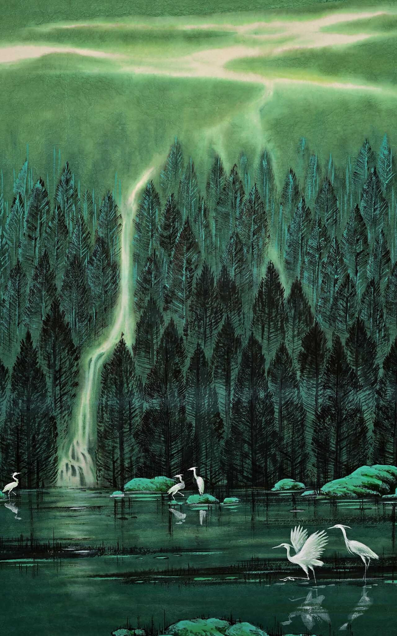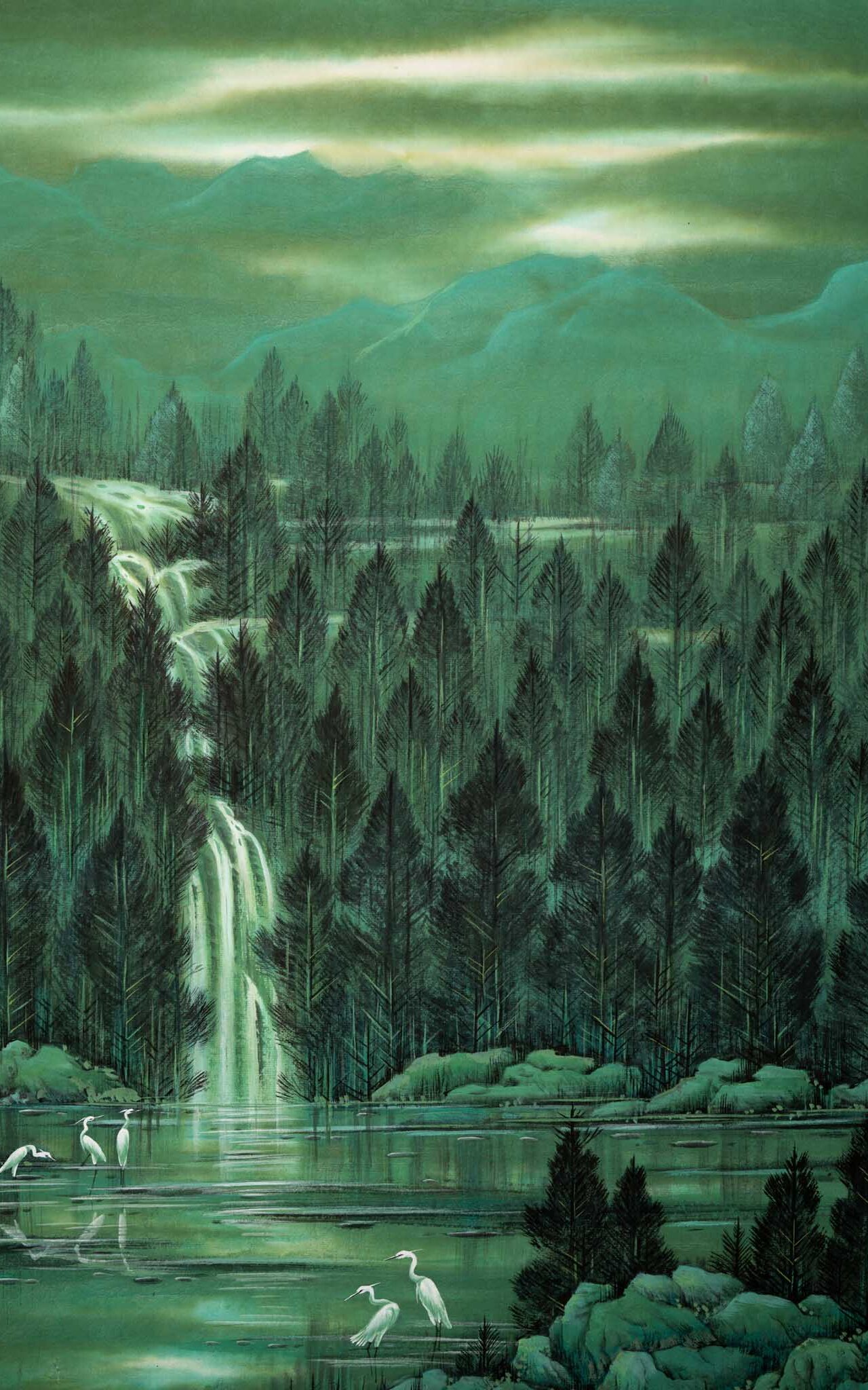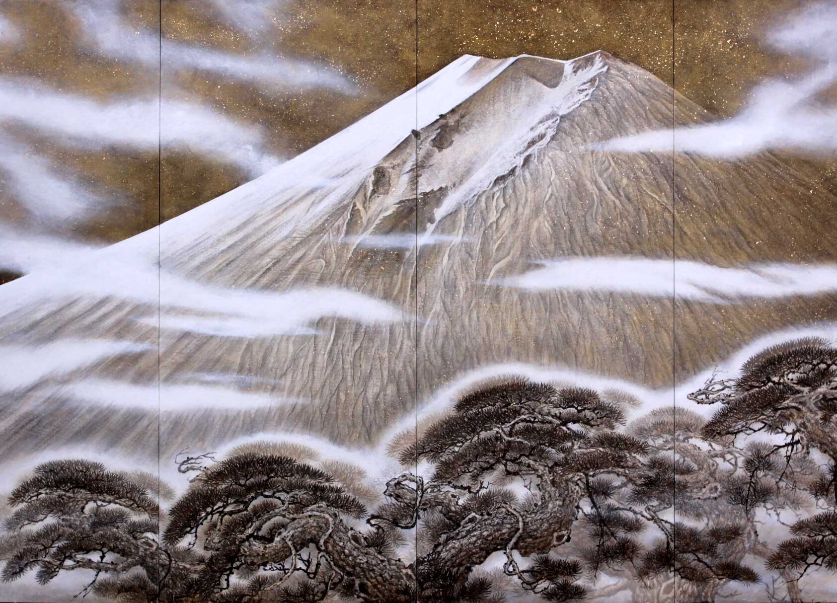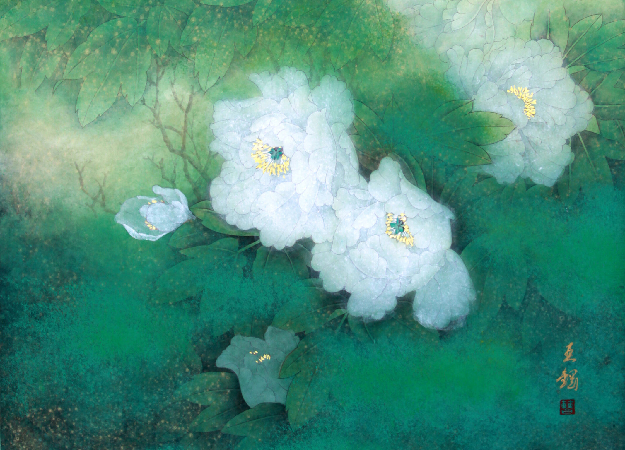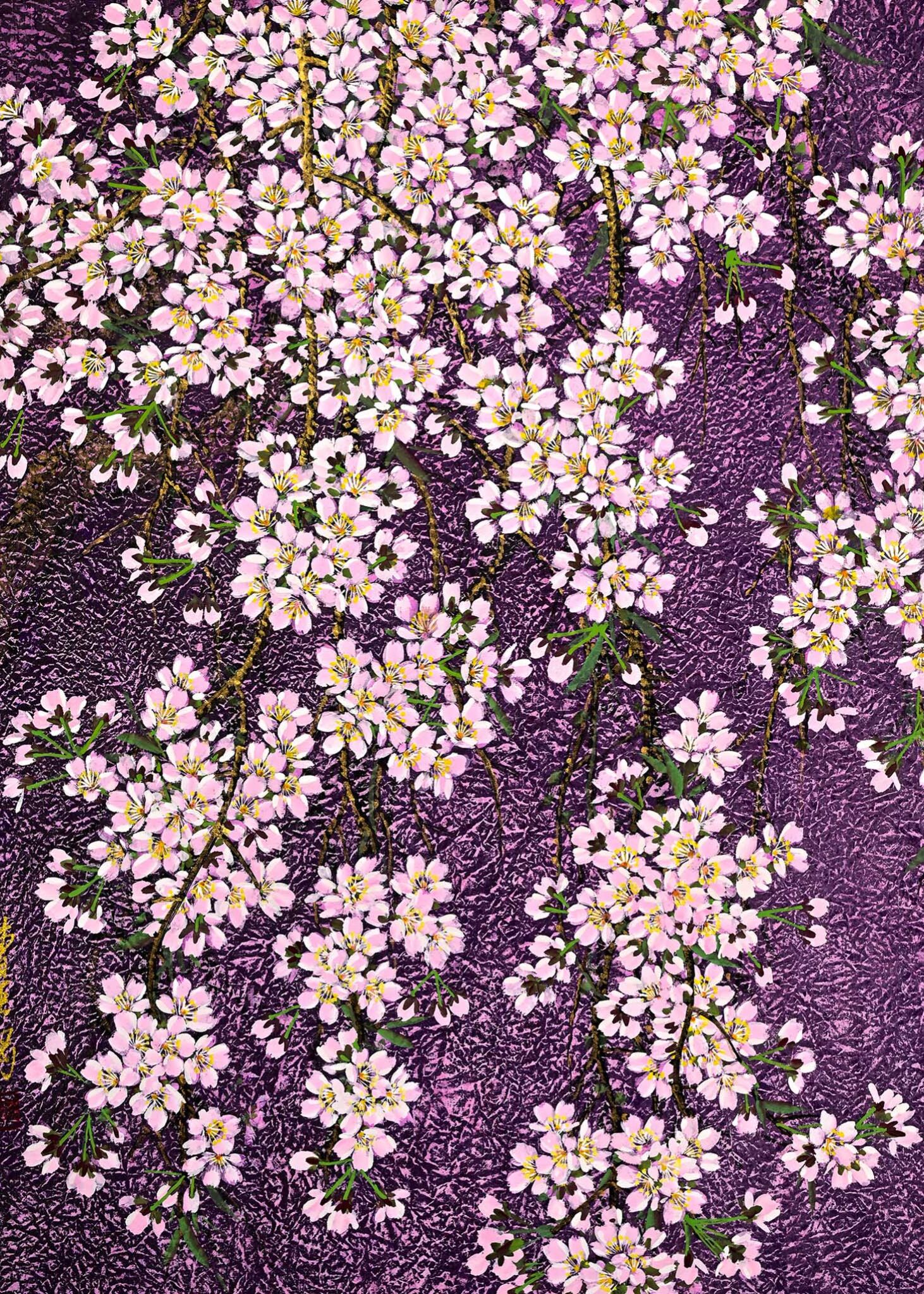 美術ジャーナリスト 永田 晶子 Art journalist Akiko Nagata おびただしい桜の花が、今を盛りと咲き誇って夜空に広がる。個々の花や枝々は写実手法で精緻に描かれているが、背景は濃い暗色に沈み、時代と場所を超越した抽象性を感じさせる。巨大な金色の満月にも墨が刷かれ、淡い桜色や花びらの形を引き立てる。画の前に立つ鑑賞者は、明日には散りゆく桜の可憐さと濃密な生命力が強く印象づけられるだろう。 曹亜鋼氏の「桜」シリーズは、1988年に来日して中国の伝統的な水墨画と日本画を融合すべく研鑽を重ねてきた氏が「初めて手ごたえを感じた」と振り返る絵画群だ。2011年に東京・上野の森美術館で開催された大規模個展を飾った100号の大作《月夜》《春意》をはじめ、様々な様態を陰影豊かに描き、代表作の一つになった。氏が私淑する日本画家の加山又造氏(1927~2004年)は、かつて「曹君の桜は立体感がある」と評したという。装飾性が高い華麗な作風で戦後日本画壇に新風をもたらした加山氏が注目した「立体感」について、まず私見を述べたい。 桜はいうまでもなく日本文化と密接に結びつくモチーフだ。春に一斉に開花する姿は日本の原風景ともいえ、一気に満開を迎えて散っていく姿は人間の儚い生や死の象徴とされた。しかし、桜を単体で描いた作品は、日本と中国の共通画題の「梅」と比べて多くない。江戸時代は桜の下で花見や行楽を楽しむ人々が名所絵や風俗画に頻繁に描かれ、山水図花鳥図にも散見されるが 、桜そのものを主役に据えた絵画が増えるのは明治以降と言える。近代日本画をけん引した横山大観は1930年のローマの日本美術展に出品した《夜桜図》が画業の転機とな り、奥村土牛や小林古径、東山魁夷ら世を去った巨匠から現代の中島千波氏や千住博氏まで数多くの画家が桜を主題にしてきた。 だが曹氏の桜の絵画は、近現代の日本画よりむしろ桃山期の天才絵師・長谷川久蔵による京都の智積院の障 壁画《桜図》を思い起こさせる。水墨画の傑作とされる国宝「松林図屏風」の作者・長谷川等伯の息子久蔵が八重桜を描いた本作は、一つ一つの花が胡粉を盛り上げて立体的に表現され、強い存在感を持つ。桜を主題にした唯一の国宝としても知られている。やや乱暴な言い方にな るが、ここでは儚いだけでない桜本来の力強さや生命力が、桜表現の様式化や象徴化が強まる前のみずみずしい眼で捉えられていると思う。 曹氏が描く桜は、《桜図》のように物理的に厚みがあるわけではないが、通底する立体的な迫真を感じさせる。「花がすみ」と呼ばれるように、近現代日本画において桜は淡い色のマッス(塊)にしばしば表現されるが、曹作品は一輪一輪が明快な姿を持つ。茫洋とかすむ全体美でなく、個々の花を凝視したリアルさがある。 制作手法を聞いて驚いたのは、氏が桜専用の絵筆を考案していたことだ。独自の切り込みを施した筆を用いることで蕾から落花寸前まであらゆる花びらの形状を精妙に再現できるという。そのうえで、一輪ずつ濃淡の陰影を加えていく。様々な意匠の桜の作品を手掛け名手とうたわれた加山氏が称揚した「立体感」は、そうした気が遠くなるような丹精から生まれたものだったのだ。 ここで曹氏の歩みを簡潔に振り返っておきたい。1960年に中国吉林省に生まれた氏は、画家で大学教授 の父とデザイン専門家の母に絵の手ほどを受け、次いで地元天津の大学で水墨画をはじめ様々な技法を学んだ。 転機は、天津紡績大学(現・天津工業大学)美術科講師を務めていた1987年。北京の中央美術学院で行われた加山氏の講演に大きな感銘を受け翌年、日本留学に踏み切った。国立福岡教育大学で日本画などを学び、同大学院修了後は北九州市のデザイン会社に就職したが、絵画への思いが募り、退職して画業に専念。主に福岡を拠点として、伝統的な中国水墨画をベースに日本の情景や美意識を自在に取り入れた独自の画風を編み出し、日中両国や欧米で個展を重ねてきた。伝統を刷新し水墨画の新境地を開いた画業は母国でも高く評価され、中国一級美術師・教授の称号を授与されている。 「初来日から35年、つねに『日本にいてこそ自分が描け る絵とは何か?』を考えている。中国水墨画は約2000年の歴史があり、世界に誇る名作群を生んだが、伝統的な絵画制作を繰り返しても未来はない。似ているようで実 は異なる特性を持つ日本画の技法や素材、美学を理解し取り入れることが自分の個性の確立につながり、中国と日本文化の新たな架け橋にもなる」と氏は語る。 桜以外の作品を見ても、そのパワフルな結合に目を奪われる。例えば、墨を底色に使い岩彩の色を浮かび上がらせた「重彩色」シリーズ。筆者が古代中国・馬王堆漢墓の出土品を連想した深みがある臙脂色や翡翠色を背景 に 、寺院や深山幽谷 、鳥が繊細な筆致で描かれる。モチーフの多くは日本の自然や建築から着想を得ているが、鮮烈な色遣いが場面の幻想性を高め、どこの国ともつか